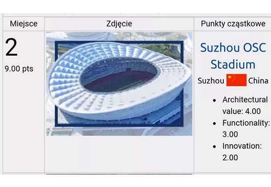 苏州奥体中心体育场荣获全球年度蕞佳球场亚军,山东省枣庄体育场位居第四名。